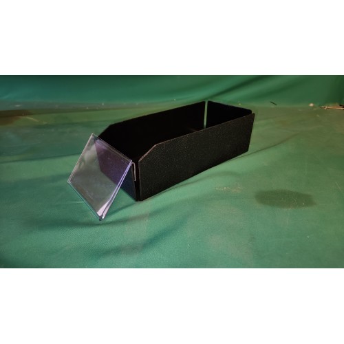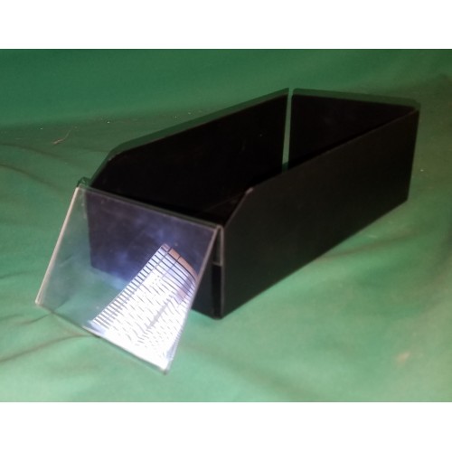 this is a lot of 6 containers 9" long by 4" w and 3" tall in 0.0625 black ABS (difficult to break) with a little clear petg front sign to describe your product.